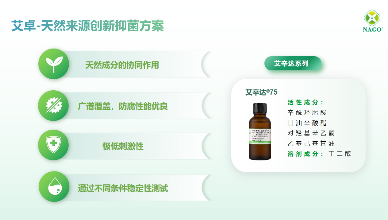 艾辛達®75——以天然抑菌成分辛酰羥肟酸為核心,復配甘油辛酸酯、對羥基苯乙酮及乙基己基甘油形成螯合-抗氧-抑菌三重屏障,天然成分占比75%超越歐盟ECOCERT天然認證基線。適用于面膜、膏霜等多元體系,通過皮膚刺激性測試驗證,實現安全與功效的精準平衡。