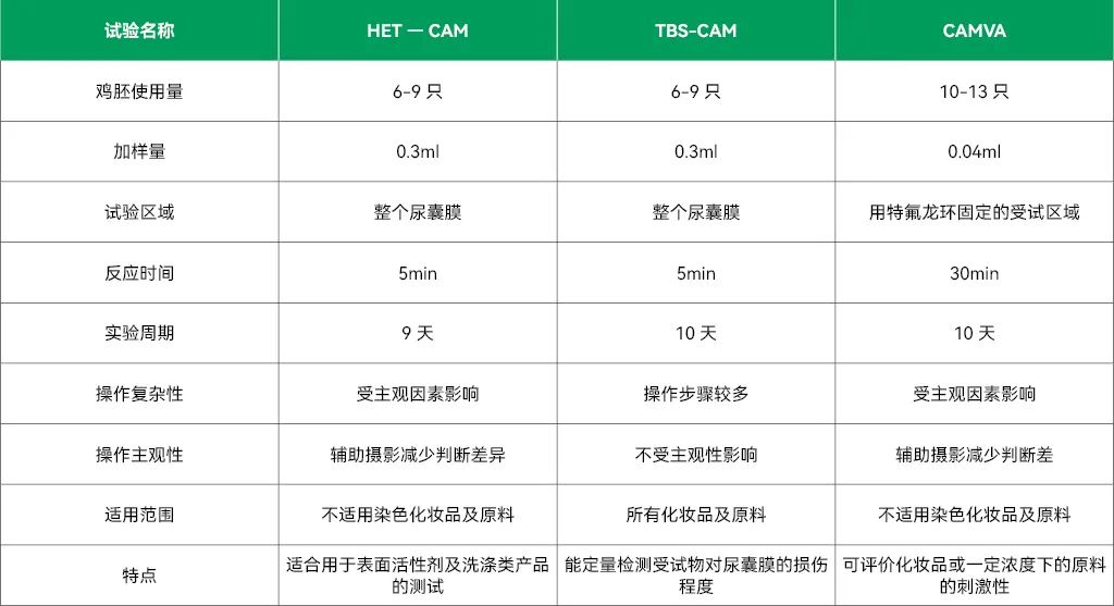 測試類型可分為四類,包括細胞(如3T3成纖維細胞,人原代角質形成細胞等)、離體器官(如牛角膜、豬角膜、兔眼球、雞眼球等)、類器官(如雞胚等)、人工組織方法(如重建角膜Epiocular、3D表皮模型等)。其中絨毛尿囊膜(chorioallantoic membrane,CAM)取樣方便、容易,中胚層富含的血管網絡很好地模擬了眼結膜結構,因此,是眼刺激性試驗替代方法中廣泛使用的模型之一。